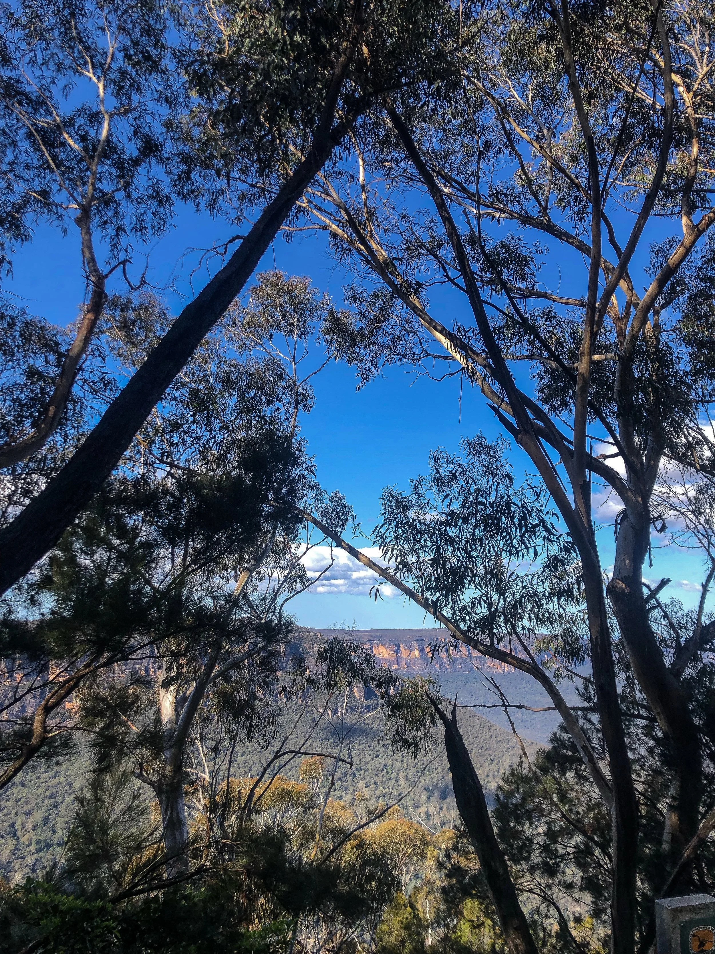 A glimpse of the Blue Mountains through the trees on a hiking track